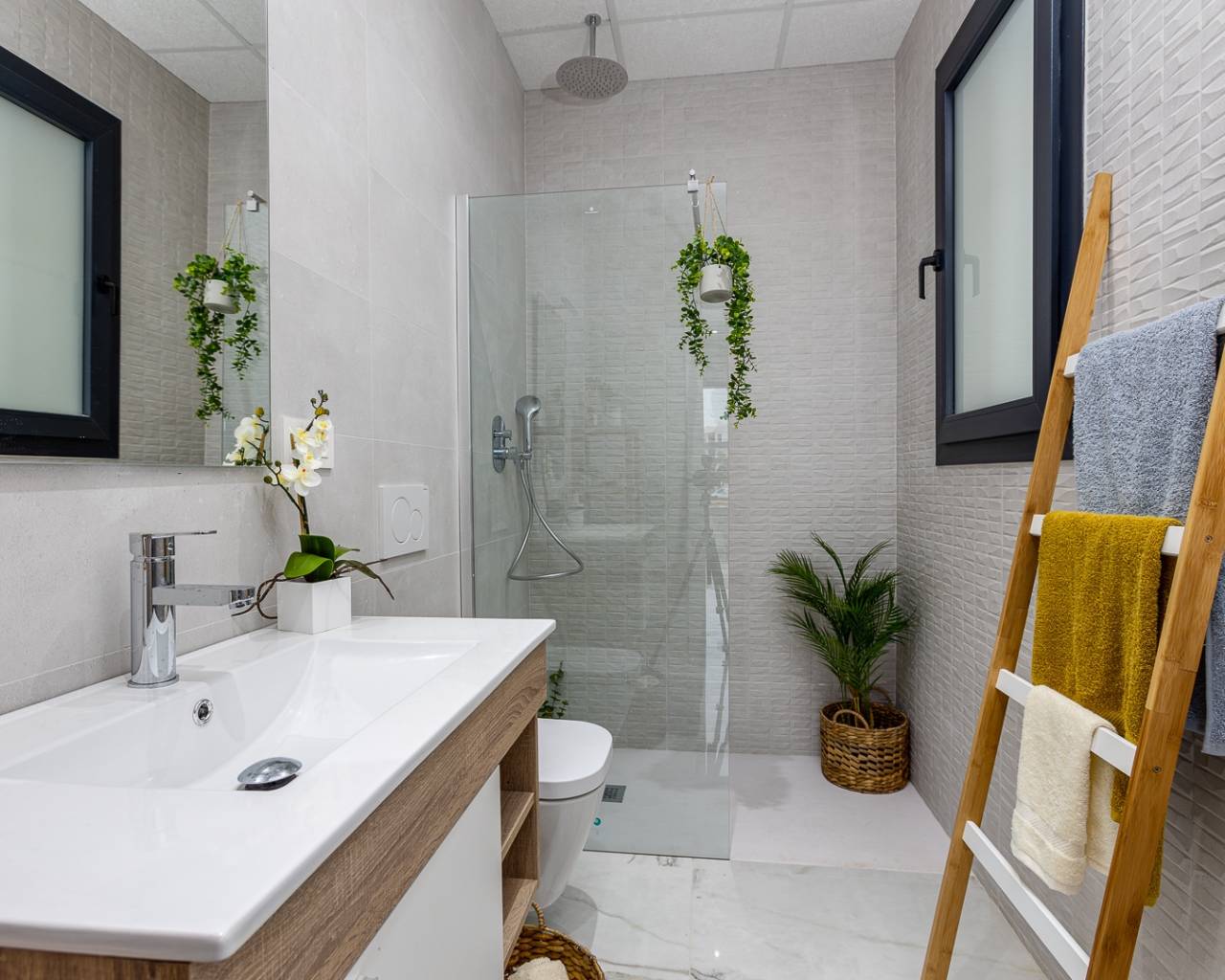 El proyecto ofrece bungalows modernos con 2 dormitorios y 2 baños, disponibles en planta baja con jardín privado o planta alta con solárium privado.