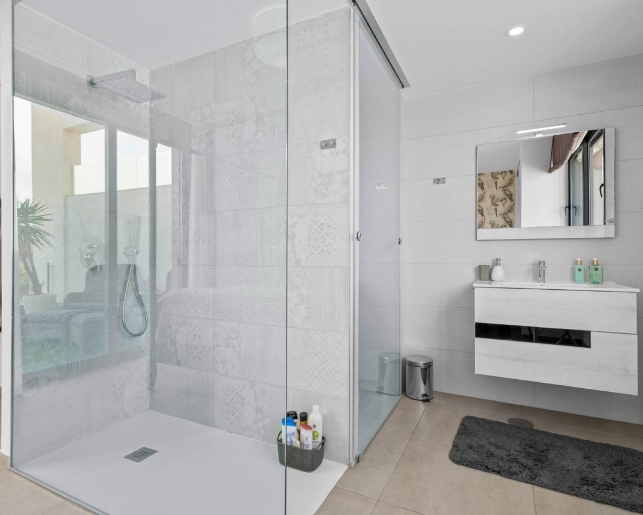 En esta planta hay un amplio baño de invitados y dos dormitorios, uno de ellos con baño en suite. Ambos dormitorios cuentan con armarios empotrados, y desde el dormitorio principal hay una gran puerta con acceso directo al jardín, lo que permite la entrada de abundante luz natural.