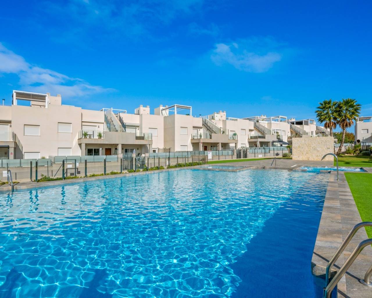 Este moderno ático en la popular zona de Aguas Nuevas ofrece dos dormitorios, dos baños, una amplia terraza privada en la azotea, zona de piscina comunitaria y plaza de garaje — a tan solo aprox. 1,5 km de la playa.