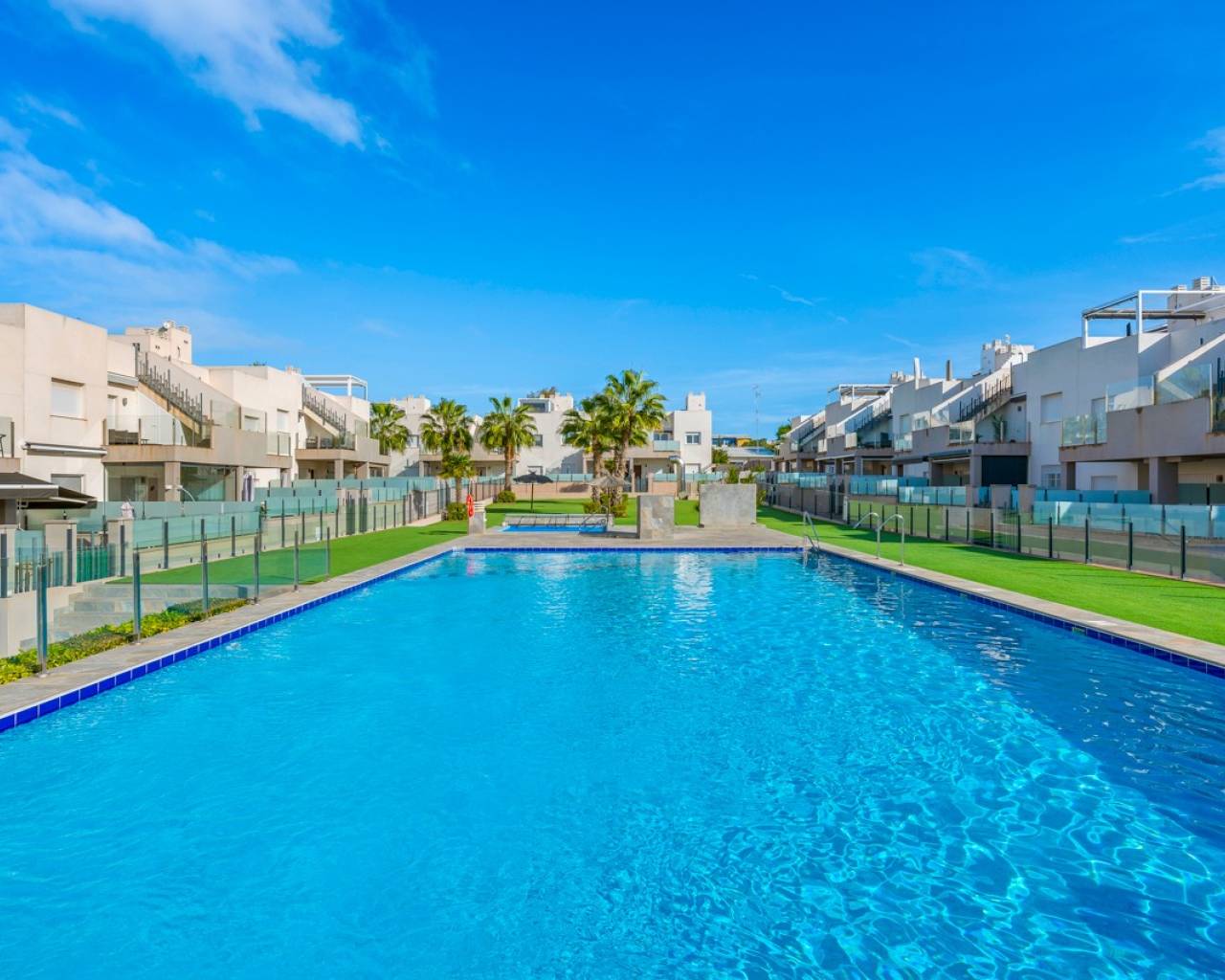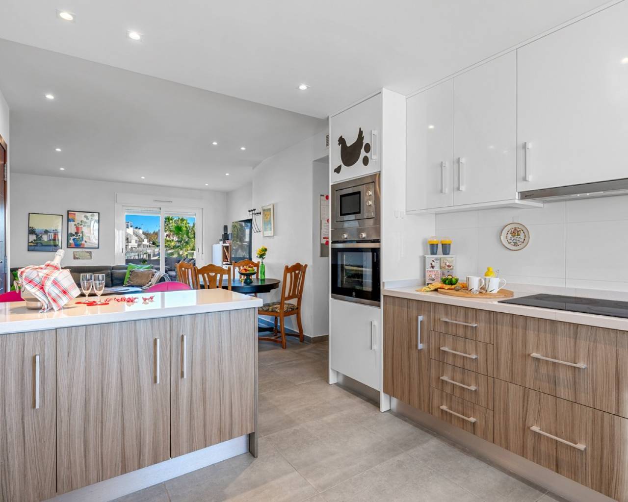 El apartamento se encuentra en una zona residencial de reciente construcción, dentro de un atractivo complejo con viviendas tanto en planta baja como en planta alta. La vivienda está situada en la segunda planta y cuenta con un luminoso y acogedor salón con acceso directo a una agradable terraza de aproximadamente 13 m². Desde esta terraza, una escalera conduce a la gran terraza privada en la azotea de casi 70 m², donde hay espacio de sobra para una zona de comedor, tumbonas y área lounge. En la azotea hay dos pérgolas que proporcionan una agradable sombra y facilitan la creación de diferentes ambientes para el descanso y las veladas sociales.