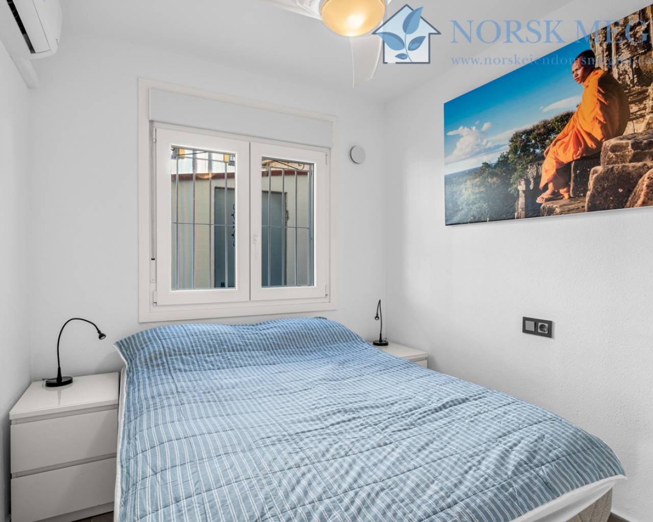Eiendommen har en flislagt og lettstelt hage samt bod på tomten. I første etasje finner du ett soverom, ett bad, fullt utstyrt kjøkken og en lys stue med spiseplass. Fra kjøkkenet er det direkte utgang til bassengområdet – ideelt for et avslappet middelhavsliv.